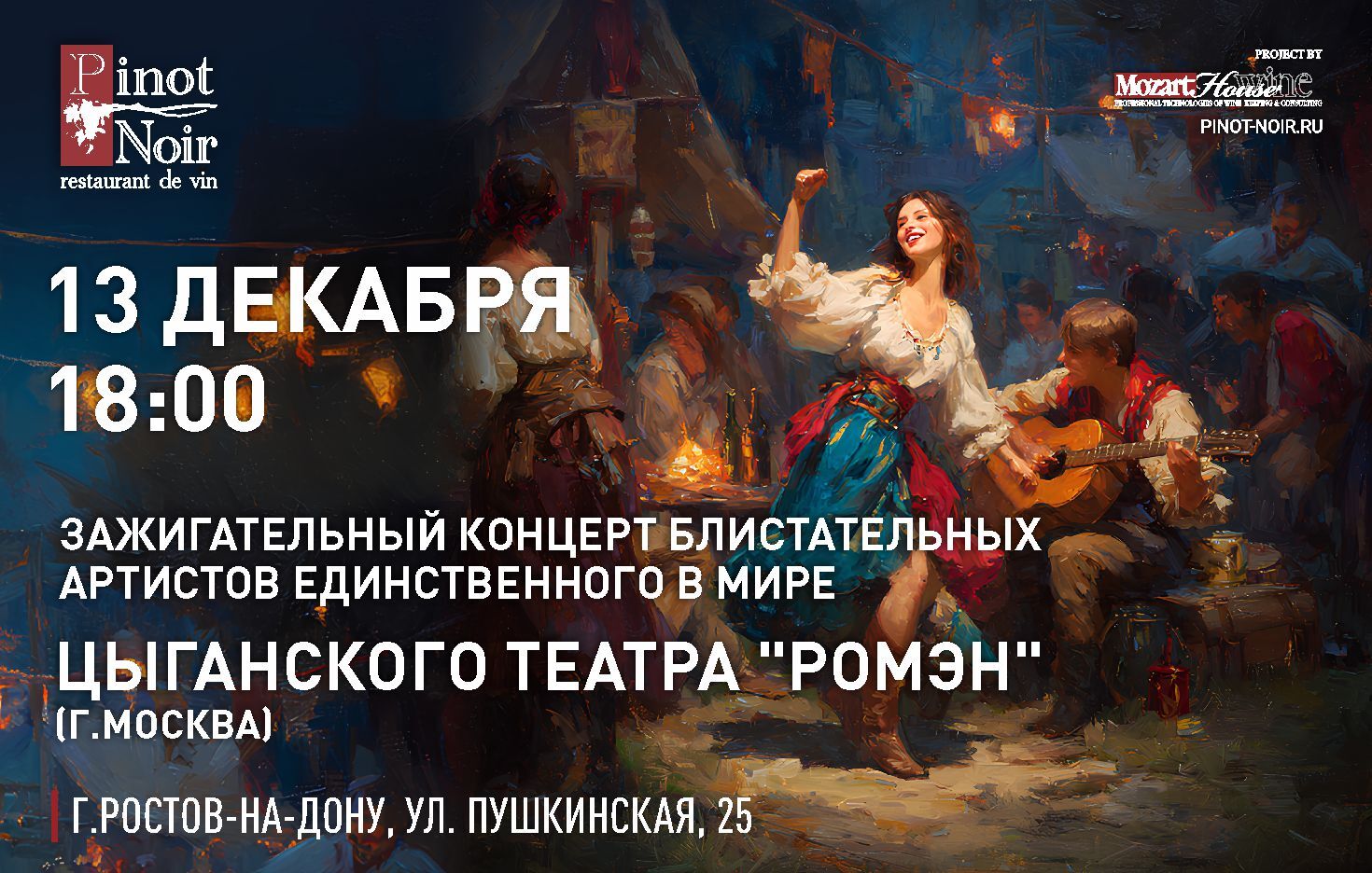 Звезды главной цыганской сцены страны - уникального театра "Ромэн" (г. Москва) - представят незабываемую музыкальную программу - от народных напевов, близких сердцу романсов и знаменитых композиций цыганского фольклора до огненных танцев в роскошных костюмах.